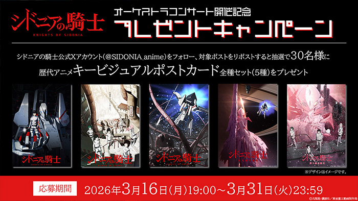 初のオーケストラコンサート開催を記念して、『シドニアの騎士』公式Xにてプレゼントキャンペーンの実施が決定いたしました。『シドニアの騎士』公式Xアカウント(@SIDONIA_anime)をフォロー&対象ポストをリポストいただいた方の中から抽選で30名様に、歴代アニメキービジュアルのポストカード全種セット(5種)をプレゼント!たくさんのご応募お待ちしております!