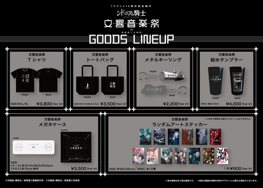 2026年4月18日(土)・19日(日) 「TVアニメ10周年記念興行『シドニアの騎士 交響音楽祭』:主催 東亜重工芸術局」にて販売したグッズにつきまして、事後通販が決定いたしました。当日会場にお越しいただけなかった方や購入を逃してしまったアイテムなど、この機会にぜひご注文ください。