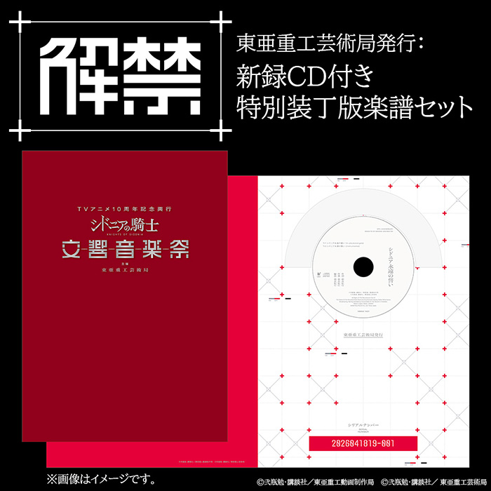 TVアニメ「シドニアの騎士」音楽監督・朝倉紀行が本公演のために特別アレンジし、新録音したシドニアの騎士テーマ曲を収録。さらに主題歌アーティスト・angelaをボーカルとして迎えたスペシャルバージョンも含む全2曲に、今回用に書き起こした本テーマ曲の楽譜を加えた、シリアルナンバー付き豪華セットです。